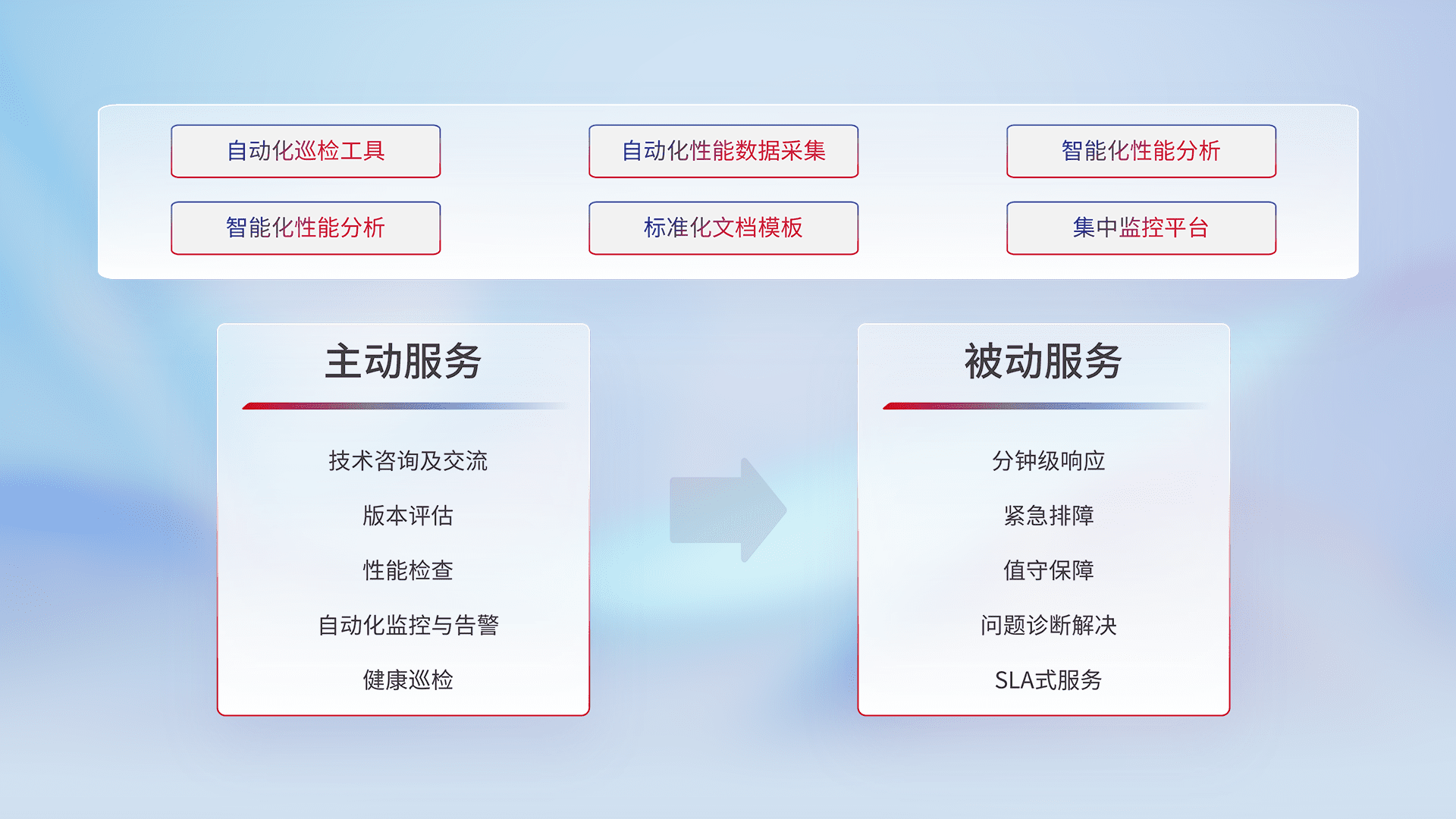 智能化工具和标准化文档,,保障服务质量,,提供主动服务(包含技术咨询、、版本评估、、性能检查、、、自动化监控与告警、、、健康巡检)和被动服务包含(分钟级响应、、、、紧急排障、、值守保障、、、、问题诊断解决、、、SLA服务)。。。。